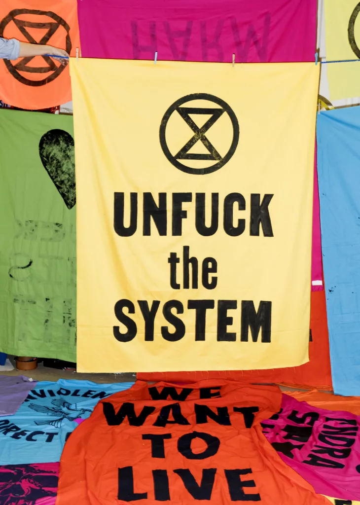 Banners created in the XR Art Factory for the Rebellion in September 2020. Photography by Immo Klink